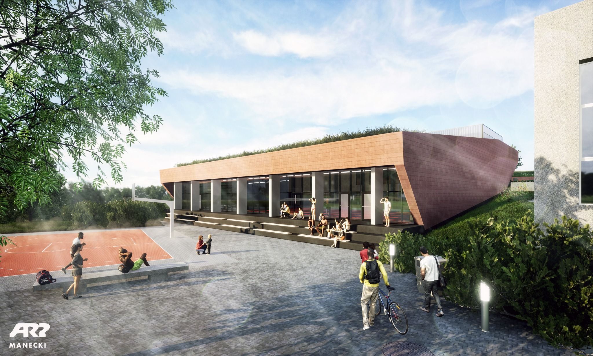 W ramach inwestycji zagospodarowana zostanie równie¿ przestrzeñ przyszkolna. Powstan± m.in. ci±g pieszo-jezdny, miejsca parkingowe oraz place i chodniki wokó³ nowego oraz istniej±cego budynku. Obiekt basenowy zaprojektowano tak, aby tworzy³ harmonijn± ca³o¶æ z otoczeniem. Zadbano o jego spójno¶æ kolorystyczn± i w³a¶ciwe wpisanie w istniej±c± przestrzeñ, przy zachowaniu nowoczesnej formy budynku.