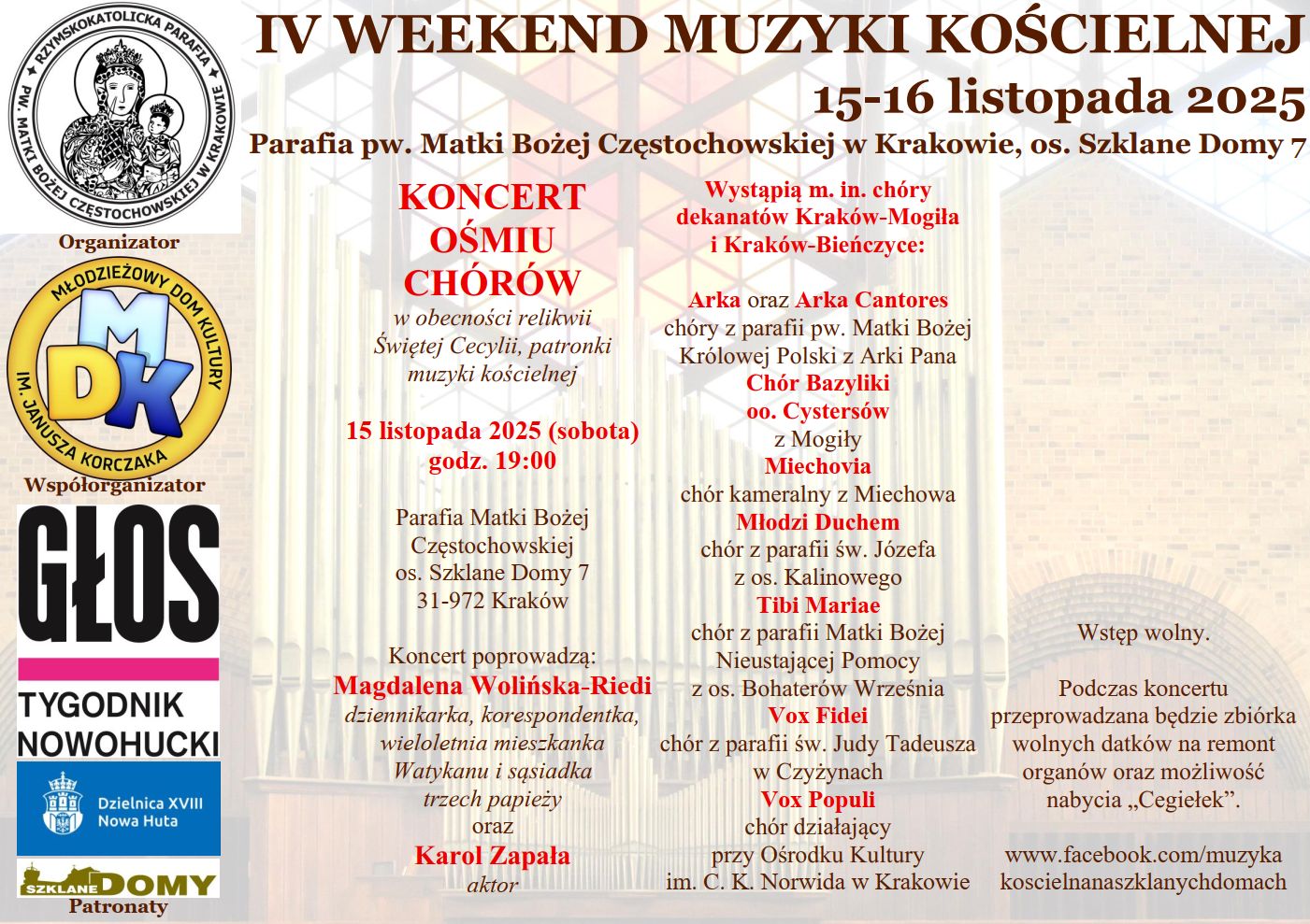 Serdecznie zapraszamy na ten wyj±tkowy w roku weekend w naszej parafii. Nie da siê ukryæ, ¿e stanowi on ewenement na szerok± skalê. W tym miejscu sk³adamy szczere podziêkowania M³odzie¿owemu Domu Kultury im. Janusza Korczaka na czele z Pani± Dyrektor Monik± Modrzejewsk± za podjêcie wspó³organizacji sobotniego koncertu, a tak¿e innym darczyñcom i patronom.